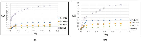 The reduction in the spacing between roughness elements leads to a decrease in the equilibrium scour depth across all roughness elements. Additionally, as the roughness elements increase in size, they cause a greater deviation of the downward flow, thereby further reducing the scour process. These findings are consistent with the results of other studies, such as Radice and Davari (2014) [], and Shahsavari et al. (2017) [], which also observed a decrease in scour depth with a decrease in the spacing between roughness elements. Notably, the most significant decrease in scour depth was observed when the spacing between roughness elements was reduced to s/L = 0.17, and the roughness level was set at p/L = 0.17.