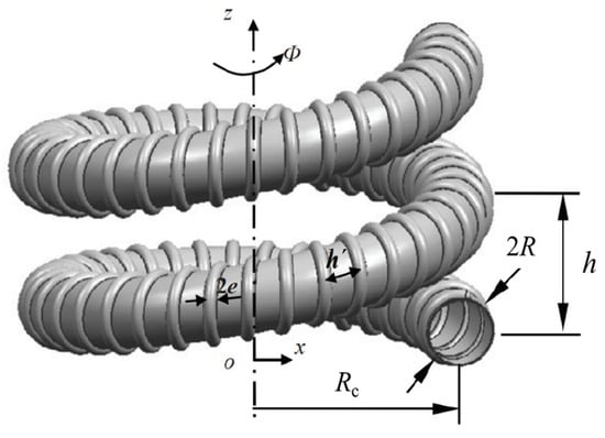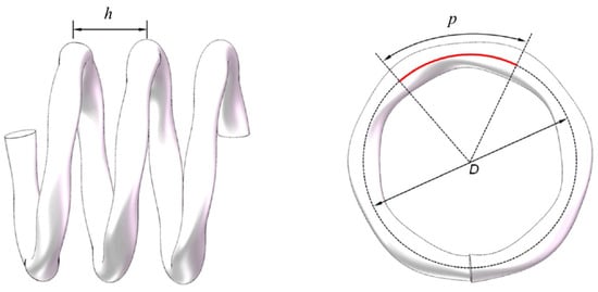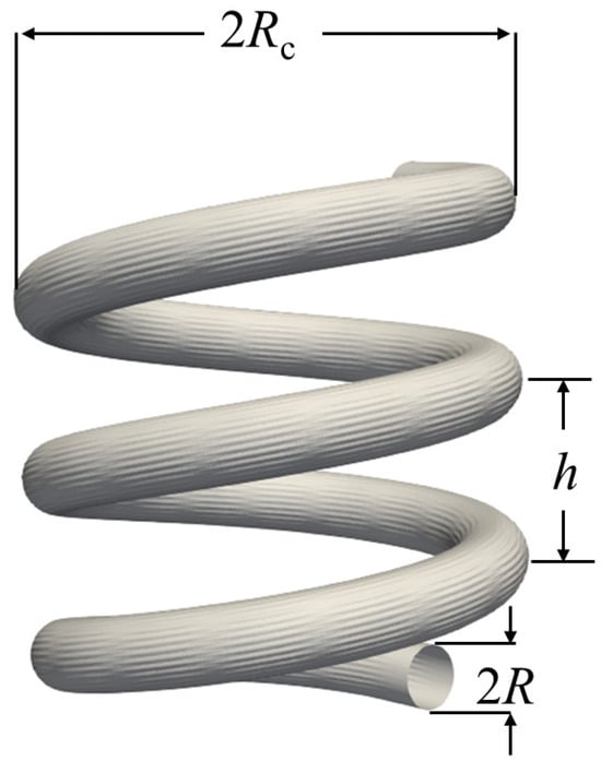 A schematic view of a typical helical pipe is shown in Figure 1. The main parameters characterizing the geometry of helical pipes are the inner radius R, the coil radius (also known as the pitch circle radius) , measured between the center of the pipe and the axis of the coil, the coil pitch h, defined as the distance between two adjacent turns, the helix angle , which is the angle between a coil turn, and the plane perpendicular to the axis of the coil. While these parameters are often used to define the geometry of typical helical pipes, in many other places, the curvature ratio is defined as the ratio of pipe radius to coil radius, , and the ratio of pitch to developed length of one turn, , which is customarily called the dimensionless pitch; these are often used to characterize the geometry of helical coils.