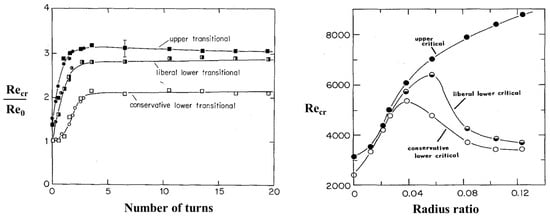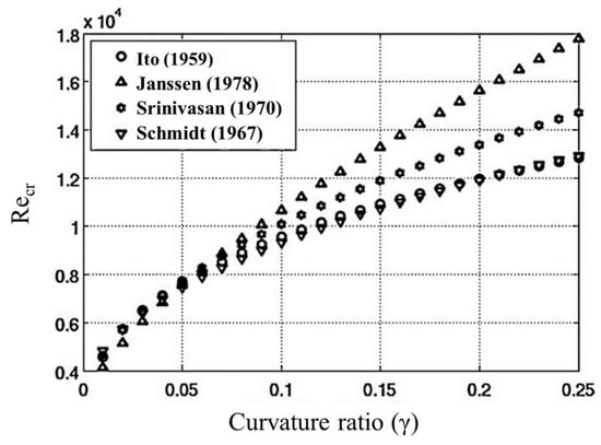 valid for . Among them, the most widely used are Ito’s and Srinivasan et al.’s correlations. While Ito’s correlation fails in the limit when , Srinivasan et al.’s correlation states that an increase in the flow velocity for which the flow remains laminar is proportional to the strength of the secondary flow [36].