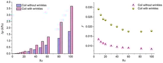 where refers to Mishra and Gupta’s [88] correlation for turbulent flow in smooth pipes and e is the roughness height. When plotted against the experimental data, Equation (31) complies with a coefficient correlation of 0.9715 (see Das’ [35] Figure 3). On the other hand, when helical coils are constructed by means of a rolling process, they may result in geometrical irregularities and imperfections, such as wrinkles and ovality. The effects of these flaws on the flow hydrodynamics were recently studied by Periasamy et al. [87]. The presence of wrinkles in the helical coil has the effect of increasing the equivalent surface roughness. In fact, in their experiments, the effects of wrinkles were assessed by measuring the friction factor and comparing it for coils without wrinkles. The pressure drop as a function of Re based on their experimental data is shown in the left frame of Figure 5, while the right plot depicts the friction factor for coils with and without wrinkles. In particular, at higher Re values, the wrinkles contribute significantly to the pressure drop across the coil, and therefore the presence of wrinkles increases the friction factor compared to the case of smooth coils.