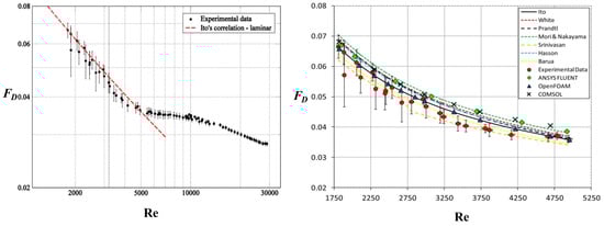 More recent experimental measurements of the friction factor for laminar flow in helical pipes were reported by De Amicis et al. [37], who also compared their experimental data with numerical simulations using different CFD tools. The experimental measurements correspond to a test facility built at the SIET laboratories in Piacenza, Italy, which reproduces the helically coiled Steam Generator of the IRIS nuclear reactor [16]. The left frame of Figure 6 shows their measured Darcy friction factors for varying Re in the laminar regime, i.e., for , where they are compared with Ito’s [73] correlation. The predicted value of marks a first discontinuity and initiates a regime with lower friction factor up to . This trend agrees very well with the predictions by Cioncolini and Santini [94] for medium-curvature coils in the range . A second discontinuity occurs at about , which marks the onset of turbulence. The right plot of Figure 6 shows the dependence of the Darcy friction factor on Re in the range for the SIET duct as compared with several correlations and numerical results from different CFD tools. The errors between the numerical predictions and the experimental data were all reported to be within 5%.