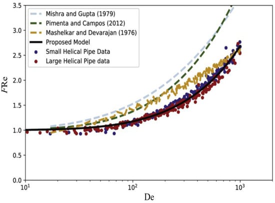 On the other hand, correlations for the pressure loss in terms of De were also reported in the literature for helical pipes with small pitch. In particular, Dean [13,14] provided a solution for fully developed laminar flow along a torus (for ) by perturbing the solution for Poiseuille flow in a straight pipe, which in terms of the friction factor ratio can be written as