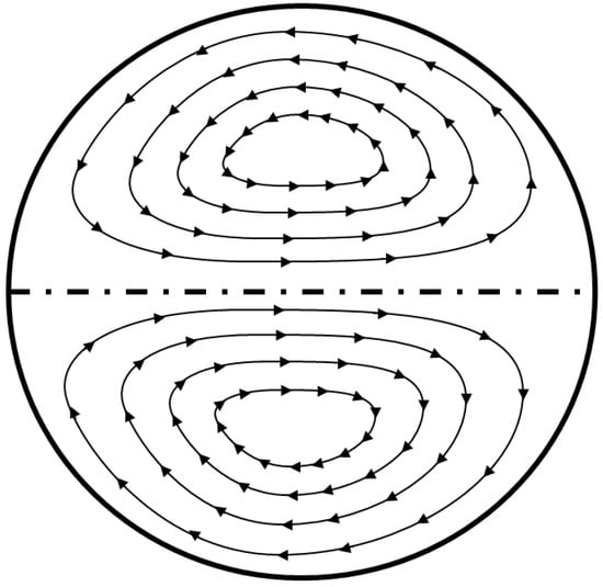 was derived for the transition from two- to one-vortex flow [71]. Therefore, helical flow is governed by , and , and it is precisely through Gn that the torsion effects come into play. For , the important parameters will be only De and Gn, and, when (i.e., ), the only relevant parameter will be De. It is important to mention that, for low Dean flows (i.e., ), the parameter governing the flow pattern transition from two- to one-vortex flow is [71]
