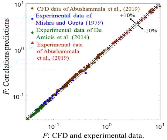 where , is the coil radius and is the lift angle. As shown in their Figure 11, the empirical correlations proposed by Ito [96] and Srinivasan et al. [74] were found to underestimate the experimental data for , with maximum errors of about 80%. However, a better agreement was found when comparing the experimental pressure drops for two-phase flow with the values predicated on the empirical correlations proposed by Ju et al. [97], Hardik and Prabhu [98] and Xiao et al. [99] (see Zheng et al.’s [95] Figure 12).