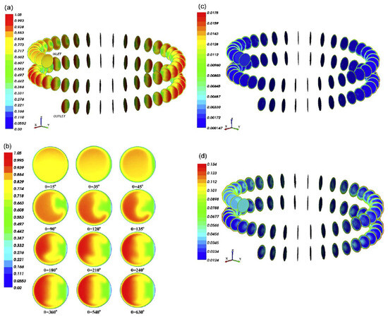 Similar results about the laminarization of turbulent flow in curved and helical pipes were also obtained experimentally by Kurokawa et al. [61] for low-Reynolds turbulent flow using smoke visualization and velocity measurements by means of hot-film anemometry. They also confirmed that the laminar flow in the downstream straight section is at a higher Re value compared to that in the upstream section. Further experiments on flow in helical pipes were carried out by Webster and Humphrey [62,63], who found that periodic low-frequency instabilities appeared at for a helical coil with a curvature ratio of 0.054. In Ref. [63], these authors report flow visualizations for Re values between 3800 and 8650 (corresponding to Dean numbers in the interval ). By means of computer simulations of the experimental set-up at (), a rather complex interaction was found between the centrifugal force due to the curvature and the cross-stream velocity, thereby explaining the mechanism of the traveling wave instability observed in their experiments.