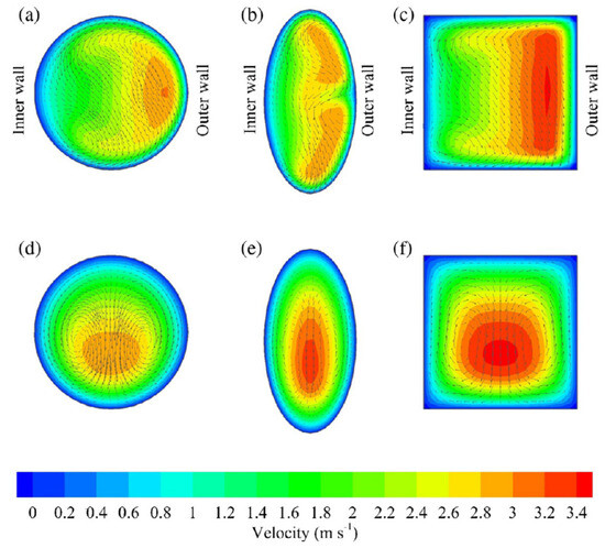 - Choi, H.K.; Park, S.O. Laminar entrance flow in curved annular ducts. Int. J. Heat Fluid Flow 1992, 13, 41–49. [Google Scholar]