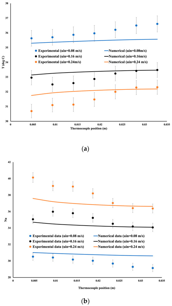 Each measurement required three hours to reach a steady state before collecting data. In addition, each experiment was conducted three times, and an average value was reported. Figure 5 presents a comparison between the experimental and numerical data. The temperature distribution is shown in Figure 5a. As the velocity was set equal to 0.08 m/s, the temperature increased along the flow direction, and the maximum difference between the measured and numerical results was less than 1 °C. As the velocity increased, the temperature dropped due to an increase in the cooling process. As the flow increased further, similar discrepancies existed. The lower experimental temperature was presumed to be due to some heat lost to the surroundings. However, the authors believe that this comparison is acceptable, and the model is accurate enough to further study the thermohydraulic performance of the designed porous structure. Figure 5b shows the local Nusselt numbers as they are compared between experimental and numerical values. A very good agreement was obtained between the experimental and the numerical approaches.