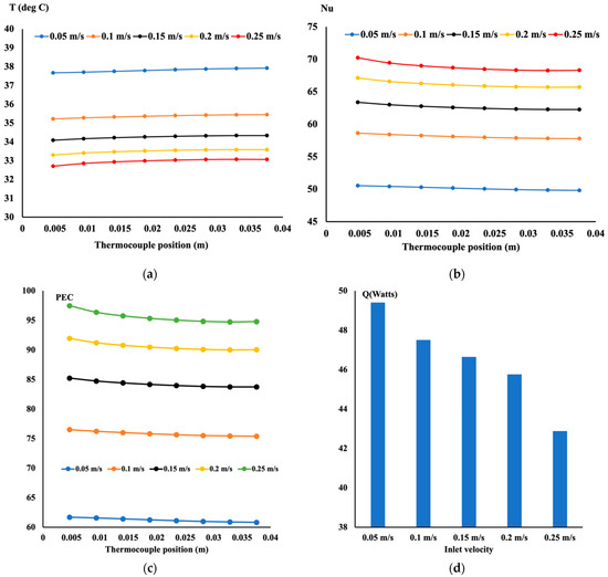 Figure 6 presents the temperature (T), the local Nusselt number (Nu), the performance evaluation criteria (PEC), and the amount of heat absorbed by the water (Q) when the porosity was set equal to 0.7. In Figure 6a, the temperature distribution decreases as the inlet velocity increases. This led to more heat being released into the circulation of water. A large temperature gradient at the entrance is a good indicator of the development of the boundary layer. When it is fully developed, the temperature slope is reduced to zero. In addition, a higher flow velocity leads to lower temperatures. This is also evident in Figure 6b, where the Nusselt number slightly decreases at the entrance, and then a flat variation is detected. A greater Nusselt number magnitude is found at a higher inlet velocity. It is worth noting that the friction factor was evaluated for all cases and combined with the average Nusselt number to assess the performance evaluation criteria. Figure 6c shows the performance evaluation criterion (PEC) variation along the flow path. It is evident from this figure that the highest PEC is when the flow increases. Figure 6d shows the amount of diffused heat released into the water flow. The slower the flow, the more time is given to the heat to diffuse into the fluid. The difference between all cases of heat released is, at the most, 12%. One can observe from this figure that a porous medium is a practical material for cooling hot surfaces. The presence of this structure in the model allows for a higher friction coefficient and heat removal.