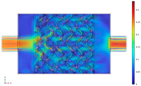 The complexity of the numerical simulation is due to the porous medium structure. As indicated earlier, some expansion and contraction channels exist within this structure. Therefore, the flow may accelerate or decelerate within the porous structure. Such a problem did not exist when metal foam, such as porous media, was used. To explain this complexity further, Figure 10 presents the flow circulation at the middle plane of the porous structure. As noticed for this case, the inlet velocity was equal to 0.25 m/s. However, if one examines the flow closely, one may see an increase in velocity within the structure to reach a magnitude higher than the inlet velocity. It is believed that, inside the complex structure, some reduction in this area can lead to a higher velocity.