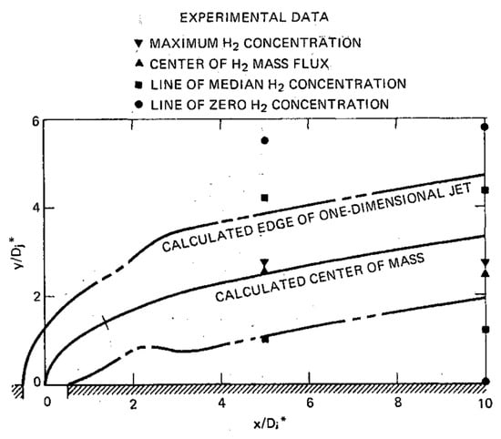 In 1971, Billig et al. [13] expanded upon the concept of “effective backpressure” by providing a suitable definition for it. They observed that when the structure of an under-expanded jet discharged into a crossflow resembles that of a jet discharged into a stationary medium, empirical relationships can be established to correlate the distance from the center of the Mach disk to the normal distance with the ratio of jet pressure to effective backpressure (Figure 2). Furthermore, a PL/I (IBM360) computer program was also developed for the complete numerical calculation of the trajectories to obtain the size and shape of the initial portion of the injected gas, the complete trajectory of the injected material, the trajectory downstream of the Mach disk, etc.