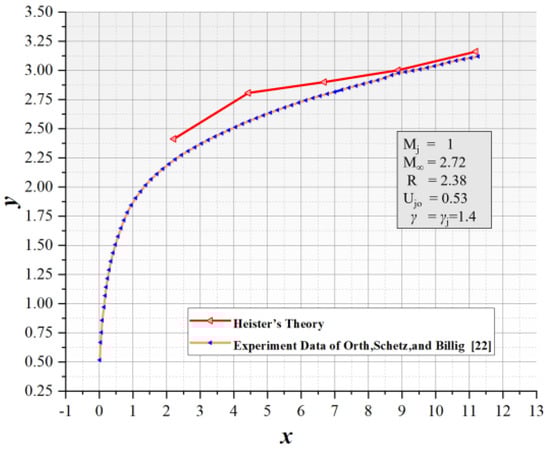 In the 1980s, the rapid advancement of computer technology led to the emergence of numerical methods as the primary approach for investigating complex and high-speed flow fields within engines [15,16,17,18,19,20]. In 1990, Heister et al. [21] made the initial endeavor to predict the trajectory of a jet in a secondary flow field without relying on empirical correlations. They combined analytical and numerical methods to propose a vorticity model for gas jets in supersonic crossflows. This model involved representing the cross-section of the jet with compressible vortices generated by the viscous and impulsive forces acting around the jet. The behavior of vortex pairs was then integrated with mass and momentum balance along the jet axis to formulate a model that describes the trajectory and mixing of the injected fluid. Additionally, numerical techniques were employed to solve for the inviscid external flow and positions of the expansion waves surrounding the jet. By combining this solution with the computed flow field of the compressible vortices associated with the jet, the trajectories of these gas jets could be predicted. Figure 4 illustrates a comparison between the predicted jet trajectories by Heister and the experimental data obtained by Orth et al. [22] in 1969.