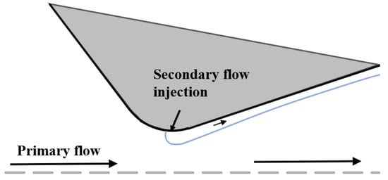 Active secondary jets have been gradually coming to the attention of researchers since the 1940s [8]. However, in early studies, the velocity of the primary flow was very low compared to the jet. In 1953, using the traditional Helmholtz–Kirchhoff method, Ehrich F.F. et al. [9] analyzed the dynamic behavior of a jet injected into a fluid flow at an angle from gaps and orifices. They calculated relationships between geometric and velocity parameters and also determined the shape of jets in several common geometric configurations. The obtained solutions were compared with experimental data of approximate outflow from a circular orifice, which demonstrated qualitative consistency.