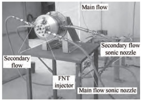 However, during the same period, in order to obtain more reliable design methods for fluidic throats in solid rocket engines, Xie Kan et al. [59,60,61] made significant achievements in the field of fluidic throat in solid rocket engines. Researchers conducted extensive numerical simulations to examine the impact of different parameters related to secondary flow (such as angle, flow ratio, position, and nozzle hole distribution) on the internal flow field parameters and dynamic characteristics of the motor. Furthermore, they conducted experimental studies on fluidic throat nozzles using nitrogen as the jet gas to validate the fluidic throat phenomena observed in the simulations. The experimental devices used for these studies are depicted in Figure 7.