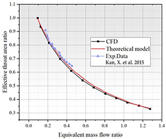 where is the effective throat area ratio, is the equivalent mass flow ratio of the secondary flow to the primary flow, and is a constant related to the primary flow gas. As shown in Figure 8, the proposed theoretical model demonstrates good agreement with both CFD simulation results and previous experimental findings. However, the study also indicates that achieving a relatively sizable throat area ratio solely through fluidic throats necessitates a significant amount of secondary flow injection. This may not be an economically viable solution for solid rocket motors. Consequently, research on controlling the effective throat area using fluidic throats has gradually diminished since then.