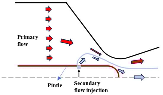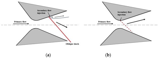 However, since the mid-20th century, people have begun to explore non-mechanical means to influence the gas flow field in the propulsion system, with the most common being the use of active secondary jet at a certain location in the flow field to achieve different functions. The active secondary jet is capable of changing the flow field structure by injecting one or more secondary streams into the primary flow at a specific velocity, which enables effective flow field control [1,2]. Compared with the method of changing the flow field by mechanical structure, the active secondary jet causes less total pressure loss in the primary flow and requires simpler devices [3,4]. Therefore, in practical engineering, active secondary flow has been widely applied, especially in the aerospace field, and has become one of the most promising technologies in many propulsion systems. Examples include fuel mixing in scramjet engines, thrust vector control and thrust adjustment in aeroengines and solid rocket engines, and engine noise suppression achieved through secondary jet.