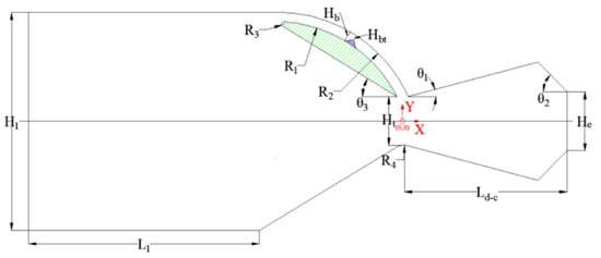 - Jing, J.J. Research on Bypass Dual Throat Nozzle with Parallelogram Cross-section and the Transition Section. Master’s Thesis, Nanjing University of Aeronautics and Astronautics, Nanjing, China, 2020. [Google Scholar]