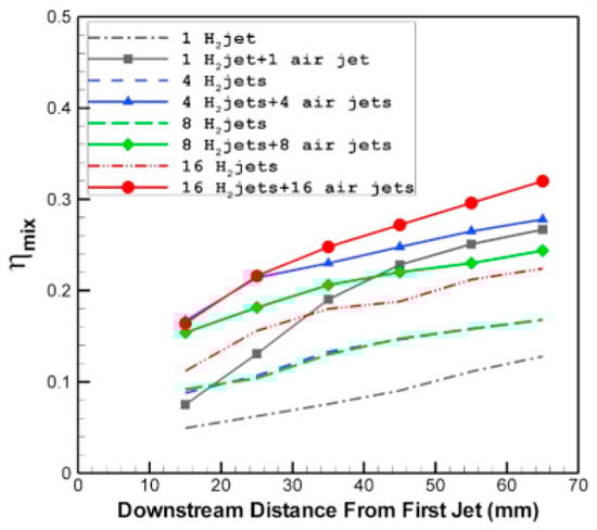 Comparison of hydrogen mixing for different fuel and air jet arrangements in downstream of fuel and air jets. (The y-axis is defined by mix efficiency) [92].