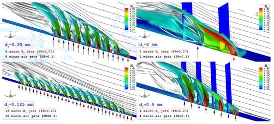 - Gerdroodbary, M.B.; Mokhtari, M.; Fallah, K.; Pourmirzaagha, H. The influence of micro air jets on mixing augmentation of transverse hydrogen jet in supersonic flow. Int. J. Hydrogen Energy 2016, 41, 22497–22508. [Google Scholar] [CrossRef]