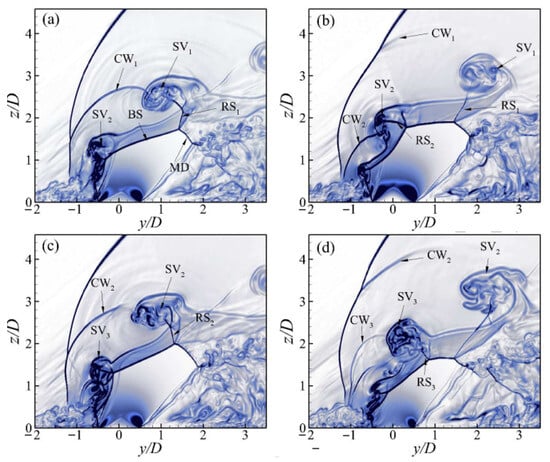 Subsequently, as numerical computation methods continued to advance, an increasing number of turbulence models and solution techniques were developed, leading to more accurate solutions for the flow field of quadratic jets. In 1998, Wilcox [23,24,25,26] proposed the k-ω turbulence model, which has a better ability to predict separation and deal with counter-pressure gradients and separated flows compared to other two-equation models. Viti et al. [27], in a study of a supersonic secondary jet flow field with a pressure ratio of 532 and a Mach number of 4, performed a numerical simulation using the RANS method as well as a k-ω turbulence model, and the three-dimensional shock structure in the averaged flow field was described in detail. Subsequently, Peterson et al. [28] and Won et al. [29] employed the Detached Eddy Simulation (DES) method to study similar problems, and the simulated transient flow field structures and average statistical results showed good agreement with experimental observations.