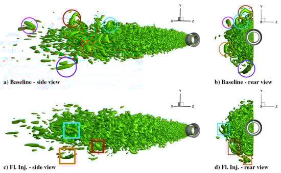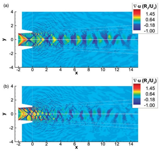- Coderoni, M.; Lyrintzis, A.S.; Blaisdell, G.A. Noise reduction analysis of supersonic unheated jets with fluidic injection using large eddy simulations. Int. J. Aeroacoustics 2018, 17, 467–501. [Google Scholar] [CrossRef]