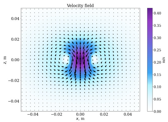 First, let us consider the velocity vector field of a vortex ring moving in a given direction (downwards, following the experimental setup) at a fixed moment (similar to the vector field shown in Figure 2). The velocity field vectors rotate clockwise on the left part of the ring and counter-clockwise on its right part, concerning the direction of motion of the ring. In the center of the vortex ring, the two rotations are superimposed, and the vectors are directed downwards. As the horizontal distance from the ring center increases, the absolute values of the velocity vectors decrease, and this dependence is described by some function .