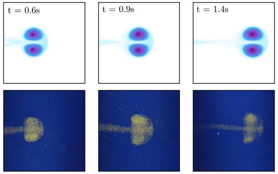 The results of our simulations are in good agreement with the existing basic theoretical results, which proves the validity of our model. First, Saffman [26] analytically derived that in the limit of , the spatial vorticity distribution tends to become Gaussian concerning the core. Second, the vortex ring propagation distance grows logarithmically with time, as predicted by Sullivan [13]. We come to the same conclusions via conducted numerical simulations. In the following, the mentioned facts are discussed in detail. Additionally, Figure 3 illustrated the correspondence between simulation and experimental images of the vortex ring evolution.