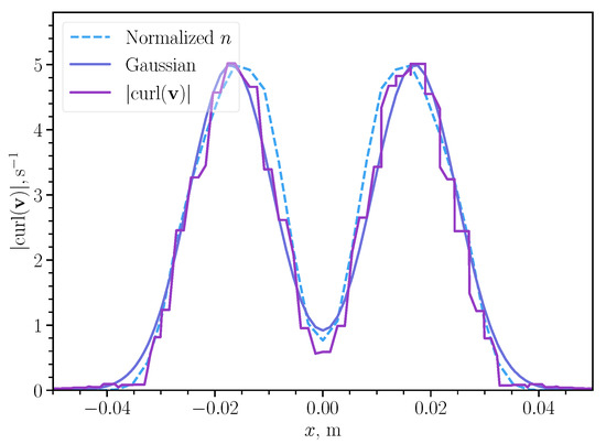 with a time-dependent coefficient . Figure 5 and Figure 6 prove this assumption to be valid. Thus, in Figure 5, the vorticity modulus and the dilute concentration have the same spatial distribution, which can be accurately fit by a superposition of two Gaussian curves. The profile of is not smooth because of the linear interpolation of the velocity field usage. To optimize the calculation time, it was decided to increase the calculation step. Despite this simplification, we can note that the type of dependence repeats the results of the Gaussian profile and the normalized particle concentration. In Figure 6, we can see that the relation between and n is close to linear. For , we found a good approximation to be