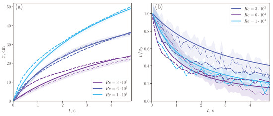 Dependence of the vertical coordinate of a vortex ring (a) and its velocity (b) on time. Experimental data are shown with dotted lines, with errors indicated by shaded areas; theoretical data are shown with solid lines; numerical simulation results are shown with dashed lines. Different colors correspond to different initial Reynolds numbers.