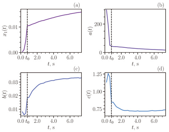 Time-dependent coefficients of the theoretical function describing the vortex ring shape. Panel (a) shows the distance from the center of the ring to one of its cores, so makes sense of the main radius of the ring R, it appears in (10). Panels (b–d) show the coefficients of , a, b and c, respectively. Also, the moment of time is marked in all the figures, it makes sense of the end of the transition period of the ring. Since in modeling the ring is formed according to the primary approximate formula, at the beginning of its evolution it naturally changes shape to its characteristic appearance. Therefore, for approximately the first second, the shape of the ring is extremely non-standard, therefore, the coefficients change very sharply at the beginning, but after the time , they acquire a monotone dependence.