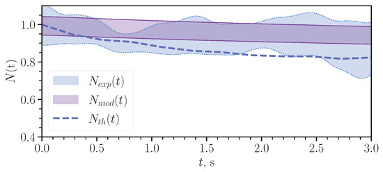 Time dependence of the relative number of particles carried by vortex rings. The experimental and modeling results are shown with light blue and violet colors, respectively. Theoretical calculation results are shown with a dashed line. The shaded areas’ width illustrates the error.
