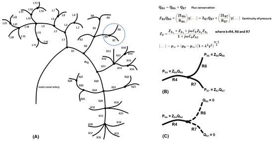(A) Schematic of the single-kidney vasculature used in our mathematical model (based on the image procured by Puelles et al. [8]). (B) An example of applying the proposed model in the bifurcation of vessel R4 to vessels R6 and R7 (uncut), where the flux conservation (Equation (1)) and the continuity of pressure at the bifurcation node (Equation (2)) are used. The impedance Zk of each blood vessel was determined using the three-element Windkessel model. (C) A schematic representing two severed blood vessels resulting in zero blood flow and zero blood pressure. The outlet blood vessels that still connected to the vascular network had a constant pressure, given by Ohm’s Law.