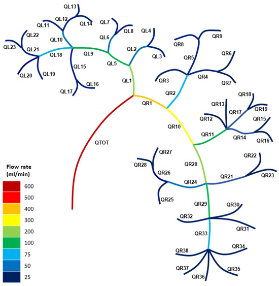 Figure 2 highlights the asymmetry in the kidney vasculature, with the major left and right primary branch blood fluxes being QL1 = 213 mL/min and QR1 = 387 mL/min, respectively. This indicates that the right section of the healthy kidney had a lower total impedance than the left section due to its primary branch, QR1, possessing a higher blood flow rate. Blood flows along the path of least resistance, which is due to multiple paths usually arising from various parallel branches. Hence, the more parallel branches and alternative paths in the vascular network, the more possible routes there were for the blood to flow. The result of Figure 2 highlights how the right section of the kidney had more paths and parallel branches compared to the left section.