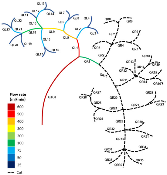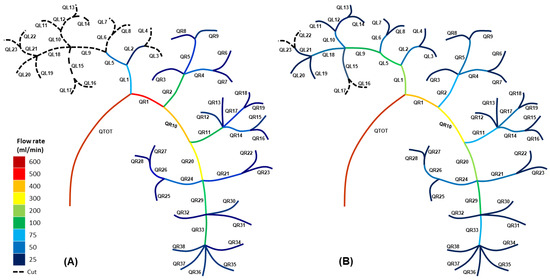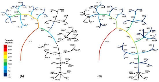 For the cuts after the nodes QL2 and QL5 (Figure 4A), the blood flux was significantly smaller for the primary left branch (QL1 = 80 mL/min) and higher for the right branch (QR1 = 520 mL/min), compared to the healthy (uncut) blood fluxes of QL1 = 213 mL/min and QR1 = 387 mL/min. Severing numerous vessels from the left section of the vascular network resulted in the blood flow being redistributed, with blood fluxes increasing in the uncut section of the network and decreasing in the altered (cut) left section. This implies that the altered left section’s total impedance had increased due to the extraction of various blood vessels and, thus, potential pathways for the blood to flow along.
