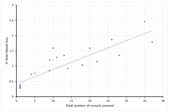 where is the total number of severed vessels, and total blood loss (mL/min) = % Total blood loss CO.