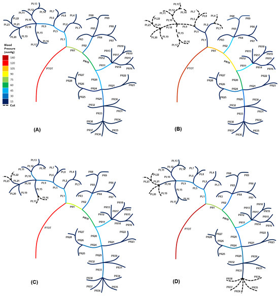 Blood pressure distribution for (A) the healthy (uncut) kidney, (B) the altered kidney vascular network with cuts after the nodes of PL2 and PL5, (C) the modified vasculature with severing vessels after the nodes PL15 and PL21, and (D) the altered network with cuts after the nodes PR33 and PL18.