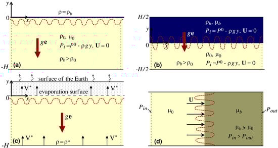 One can specify the principal problems about instability states and natural density-driven convection in porous media, to which the fluid dynamic processes described above can be reduced. Figure 1a shows the sketch of the problem about density-driven convection induced by horizontal source of admixture. Such problem is associated with solubility trapping of supercritical in saline aquifer; is assumed to be located above the saline water, and an interface between these two fluids is horizontal. A diffusive boundary layer of -rich brine appearing between the fluids is denser than both of them and therefore unstable in the gravity field. Because supercritical is lighter than underlying saline water, convective fingers propagate only downward, hence one-sided convection happens. Figure 1b shows the sketch of the problem about instability of two-layered fluid system with the upper more dense fluid, which is called the Rayleigh–Taylor instability problem. This problem is reffed to when studying conditions near salt deposits, geothermal reservoirs and solubility trapping of supercritical as well. Instability state of the system gives rise to the finger propagation upward and downward, that is, two-sided convection occurs. Despite dissolution giving rise to one-sided convection, analyzing the Rayleigh–Taylor problem provides important results for this case as well. Figure 1c depicts the sketch of the problem about instability of diffusion layer and convection development superposed by a forced flow. The vertical upward throughflow can be induced because underground moisture evaporates into the atmosphere. The problem setup is relevant for considering stability of salt lakes, soil salinization and underground dynamics associated with the “liquid water–vapor” phase transition. A porous medium is occupied with brine moving up due to moister evaporation from the boundary surface (it may be the front of liquid-gas phase transition or the Earth’s surface). The water transformed into vapor goes away from this surface, whereas dissolved salts are accumulated under the surface. The more dense unstable saline layer is formed, and this leads to the density-driven convection development. We also refer to a problem which is of paramount importance in a wide range of applications including enhanced oil recovery, carbon capture and storage, and soil remediation. This problem is about the instability and viscous fingering observed in the case of displacement through a porous medium of more viscosity fluid by a less viscosity one. This type of instability occurs if both fluids are viscous and they have different viscosity coefficients. This is called the Saffman–Taylor instability problem. The sketch of the problem is in Figure 1d. In this case, an instability state of fluid interface leads to fingering similar to that observed in natural convection. However, fingering in the Saffman–Taylor problem does not driven by the gravity force and, for this reason, we do not consider this problem in detail but refer to the principal studies [16,17,18,19,20,21,22,23,24].