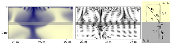To demonstrate a complex structure of “brine ball”, the subdomain confined by the red frame in Figure 2b is shown in Figure 3 (left) in an enlarged scale. The velocity field is given in Figure 3 (center). Vectors of fluid velocity are oriented more vertically when the fluid is passing through the internal layer. The observed flow refraction schematically depicted in Figure 3 (right) occurs at the interface of two porous media with the permeability contrast; this phenomenon follows from the boundary conditions [101]. At the interface, the vertical component of seepage velocity keeps its value because of mass conservation. In the horizontal direction, flow moves under the pressure gradient, which does not change at the interface, therefore, according to the Darcy Equation (11), the ratio of horizontal component of seepage velocity to the permeability keeps its value. Hence the conditions at the interface for the components of seepage velocity are as follows: