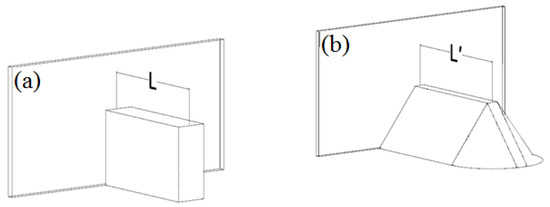 Figure 2 shows the two types of abutment examined in this study: (1) vertical wall with three different dimensions; and (2) spill-through abutment. The length of the vertical wall abutments (L) used in the study were 15, 25 and 35 cm with a width of 10 cm. The length of the spill-through abutment (L) was 35 cm; its top width = 10 cm, top length () = 20 cm and side slope = 1:1 ().
