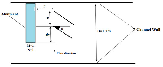 The strength of the vortex circulations induced by vanes decays as they move downstream for the reason of viscous diffusions and bed resistance [8]. Van Zwol [45] reported that the circulations persist within a distance that is twice the vane’s length. Accordingly, vanes should be installed at an appropriate distance from the abutment () to reduce flow velocity within the area between the vanes and the abutment.
