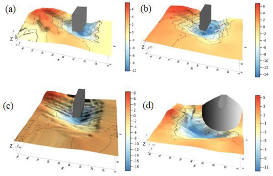 Although using submerged vanes and riprap stones as abutment scour countermeasures provides positive results, causing definitive scour depth reductions, if they are used together, one could surmise that their combined effects will be even more significant. Consequently, this study examines whether using these methods together can lead to an improved scour countermeasure method, and if so, by how much? Table 3 () shows the experimental results obtained by using a combination of submerged vanes and riprap, clearly revealing that fewer riprap stones are displaced compared to (see Figure 6c,d). This is due to the reduction of the local shear stresses and turbulence around the abutment for the presence of the submerged vanes [15,34]. In summary, the experimental data show that using both these methods together can reduce the maximum scour depth by 41% more than that using individual methods separately (compare to and in Table 3).