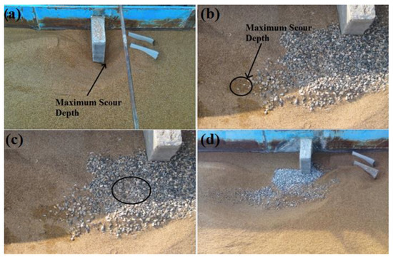 In Test , the apron width was further decreased to 20 cm to test the over-conservatism of the method of Richardson and Davies [43]. With this change, the result shows that the location of the maximum scour depth has migrated closer to the abutment toe ( and ) because the scour hole position is dependent on apron width [20]. However, edge failure, which occurs at the downstream end of the abutment as shown in Figure 7b, is more prominent when compared to that in Test . Hence, the apron width was reverted to 25 cm. However, since scouring and the dislodgement of riprap stones (edge failure) did not occur at the upstream end of the riprap apron, the apron thickness at this location was decreased by to reduce the volume of the riprap layer needed (Figure 7d). With this change, the result shows that reducing the thickness of the riprap layer has no effect on edge failure and the resulting scour depth, i.e., it did not exacerbate edge failure. The results also show that edge failure and scour depth were reduced in Test compared with Test by 12.7%. In addition, the volume of the riprap layer in Test is reduced by 32% in comparison to the baseline Test .