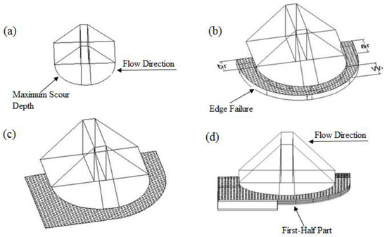 Tests to , with different apron widths and thicknesses, were conducted to obtain an apron configuration without compromising its effectiveness in this study. In Test , the width of the apron was 25 cm (Figure 7b, Geometry I), 11% shorter than that of the baseline Test, . The experimental results revealed the presence of edge failure at the apron. Observation clearly shows how a depression is first formed at the interface of the riprap stones and original bed sediments, which is the onset of “edge failure”. With time, the depression propagates, causing the riprap stones to slide into it. If this hole becomes excessively large, a total disintegration of the apron may occur [9]. Edge failure and the extent of riprap coverage are closely related; if there is a sufficient supply of riprap stones, this problem may be mitigated. Under this condition, the riprap stones that slide into the scour hole can re-armor the hole to prevent further erosion and total disintegration [9,55,56]. Accordingly, to overcome the observed edge failure, the apron was changed from a circular to a square shape (see in Figure 7c, Geometry II), with the aim of enhancing the riprap stones’ stability here (compare to ). This observation, which shows a distinct improvement, is consistent with the result of Simarro et al. [13], who reported that the apron geometry of Figure 7c is superior to that of Figure 7b.