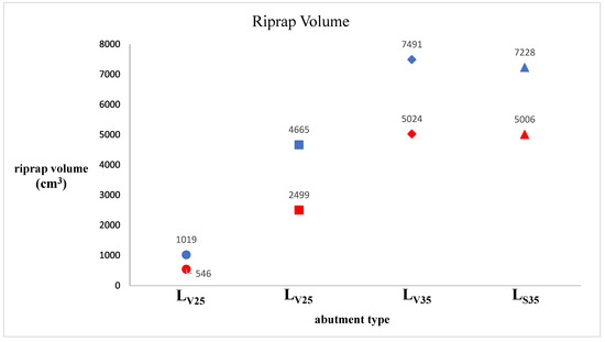 Volume of riprap layer around abutments. Blue symbols represent riprap with and red symbols represent .