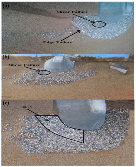If the placement of vanes still cannot prevent such failures (Figure 9b), installing another riprap layer may be needed. In this study, a riprap layer () with diameter = 15 mm, thickness = and width = 15 cm was placed around the abutment (Figure 9c). The aim is to use larger riprap stones to arrest shear failure. Test (Table 3) shows that using , the riprap layer is left intact, and shear failure is prevented (Figure 9c). One may infer from these two tests that vanes and riprap size offer different remedial actions in abutment scour countermeasures. The engineer must understand the purpose of their design when using different scour countermeasure approaches.