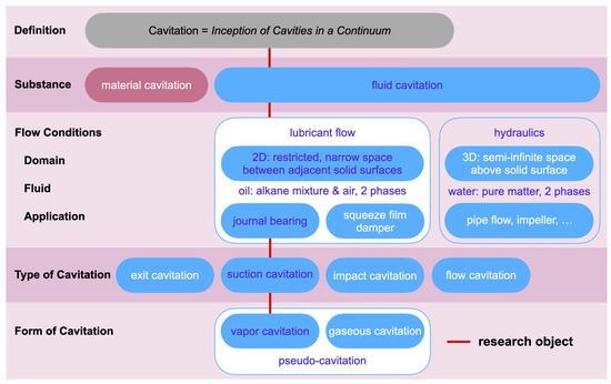 The work on cavitation demands a precise definition of the term itself, the process and its particular conditions. In general, cavitation is defined as an inception of bubbles in a continuum. The second-tier category differentiates the process according to the substance in which the cavity occurs. It is material cavitation, if the cavity is a result of erosion on the surface of, e.g., a bearing liner or a hydraulic component. If the cavity is a gas- or vapor-filled bubble in a fluid, the category is fluid cavitation.