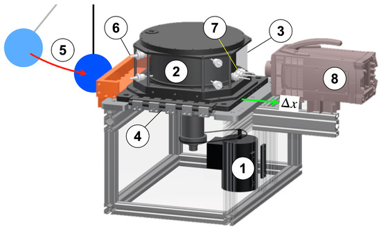 Journal Bearing Model Experiment, consisting of motor (1), cylinder (2) rotating inside the transparent cavity (3), linear traversing guide (4), pendulum (5), pressure taps (6), displacement sensors (7) and digital high-speed camera (8). ∆x denotes the radial displacement of (3) in relation to (2).