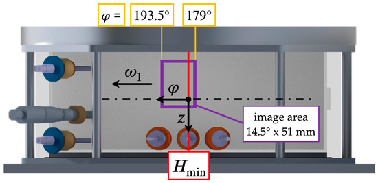 Figure 3 shows the camera’s view and the image area A, across which the image processing is performed. The image area is downstream of the minimum film thickness inside the divergent section of the fluid film. The Sommerfeld angle indicates the lateral position. The optical set-up follows the previous work [10]. A high-speed camera (IX-Cameras i-Speed 720) is used to capture bubble formation and transport inside the liquid film. The maximum data capacity of the camera is 20 Gpx/s. Hence, the resolution and frame rate have to be balanced. The experiment is recorded with a resolution of 1512 × 1098 pixels at 10,000 frames per second (fps). Based on a physical resolution of 25 px, which defines the minimum detection limit for the smallest bubble, the exposure time is set at 100 μs. Additionally, major components, including a fast lens with macro capacity (Walimex T3.1 100 mm ED) and artificial lighting (two spotlights Hedler ProfiLux LED 1000 with a combined luminous flux of 50,000 lm), complete the set-up. Due to the experiment’s physical dimensions, the lens must support close focus with a respective magnification ratio of 1:1.