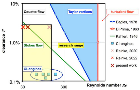 The diagram displayed in Figure 4 puts this work into a broader perspective in relation to previous work [10,11] and other studies pertaining to the Taylor–Couette flow at low clearance ratios. The diagram shows the Reynolds number and the clearance ratio that are addressed in this work. Compared to recent work [10,11] with operating points located at the corners of the targeted research range that extends towards the operational range of journal bearings in CI-engines, the current experimental campaign is carried out exactly below the limit proposed by Kahlert [14] but still inside the domain of the Stokes flow. The limit for the Stokes flow region is defined by Equation (2)