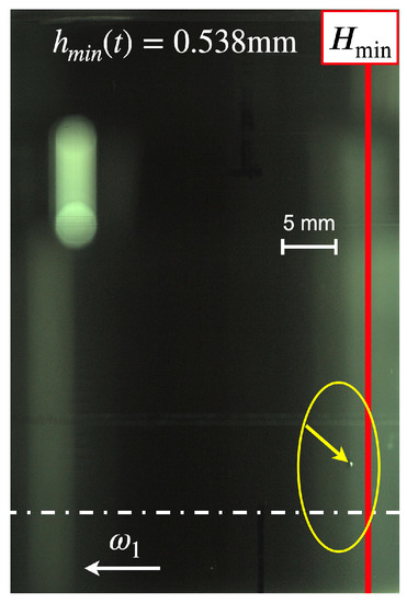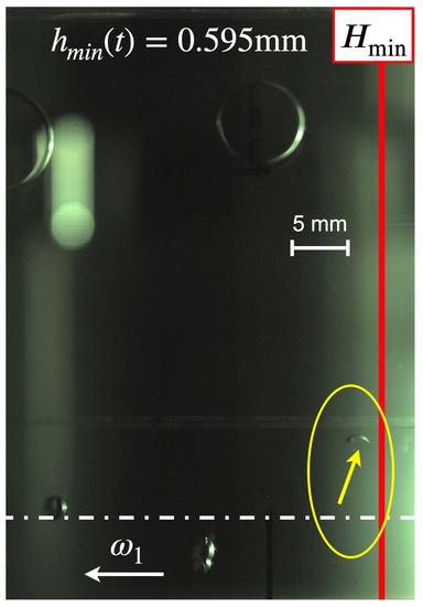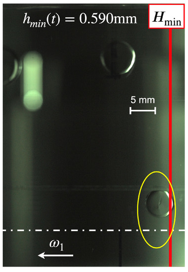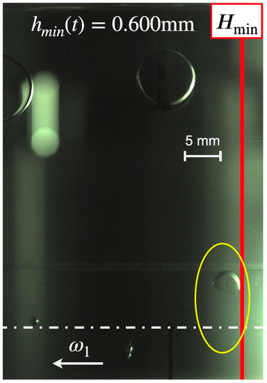 The following Figure 5, Figure 6, Figure 7, Figure 8, Figure 9, Figure 10 and Figure 11 display a digital image of a selected vapor bubble during its life cycle. A reference indicates a scale of 5 mm and the location of the minimum film thickness is marked by the red line while its actual value is shown at the top of each image at the Sommerfeld angle = 180°. The rotational direction of the inner cylinder is to the left and the cylinder’s equator is indicated by the broken white line according to the convention given in Figure 3.