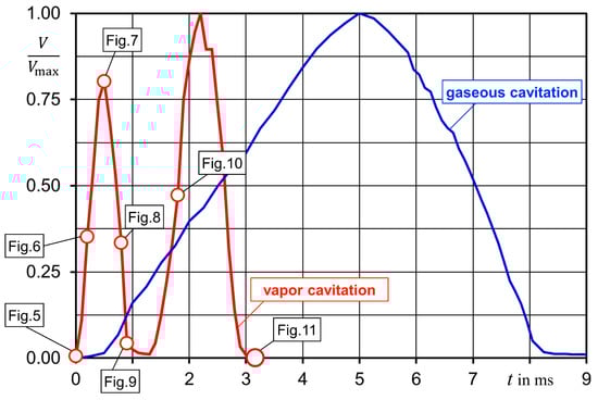 Development of the bubble volume, vapor cavitation in cavitating fluid (paraffin 96.4%, pentane 3.6%) and gaseous cavitation in paraffin saturated with air [10].